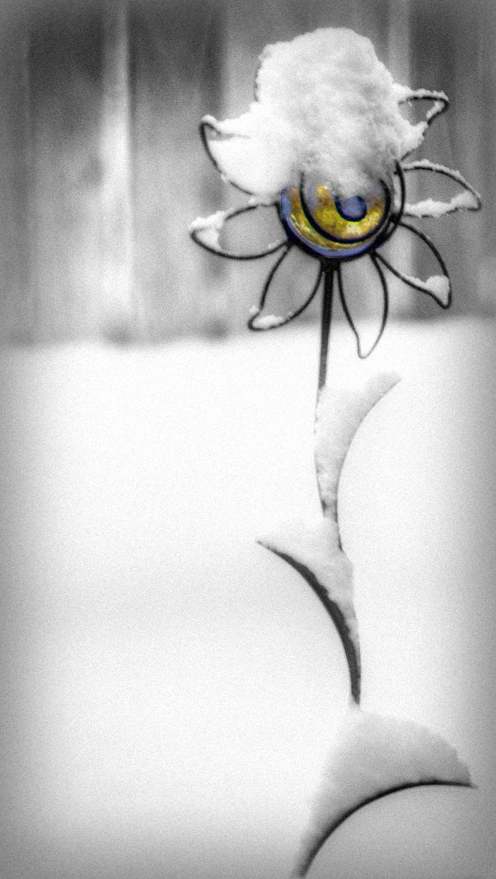 Today was another one of those blustery winter days. It starts out with snow and ends with rain. This little yard art flower looked so forlorn covered with snow just waiting for spring to arrive so it can join the other flowers.