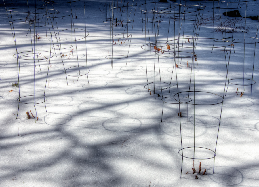 In one sheltered area, there were some fresh buds on a branch telling me that spring is, in fact, on its way. A section of the park had a planting area with stakes just waiting for the plants to arrive. I liked the patterns they made in the snow.