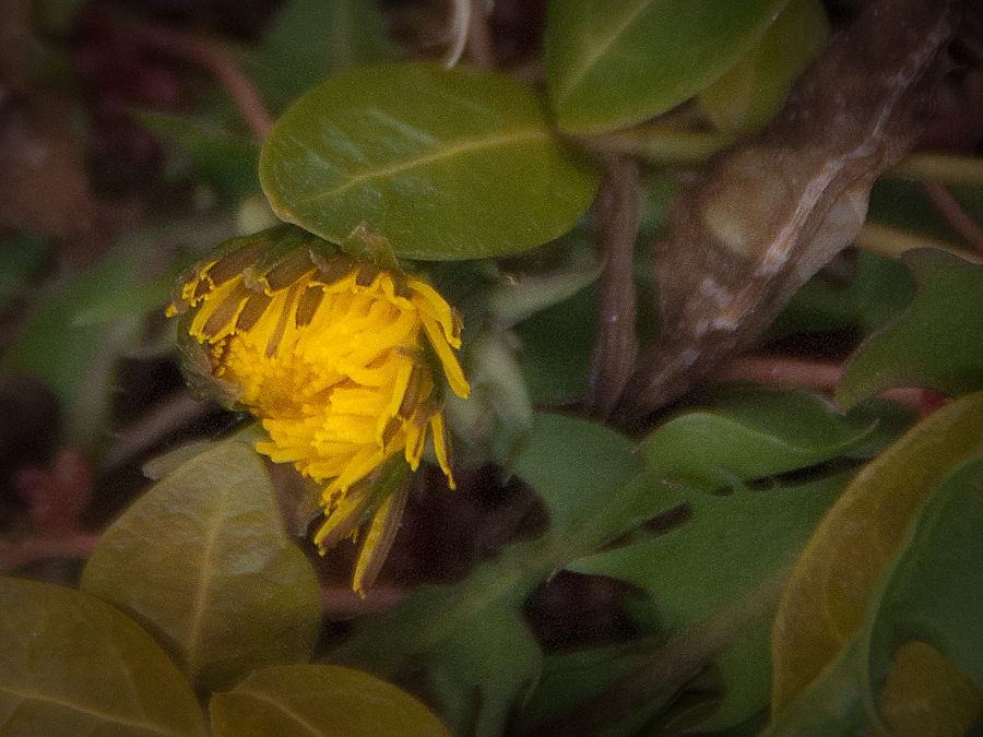 So, tonight I went into my back yard to find whatever I could to reassure me that we would actually have a spring. I found this little purple flower on a vine and a dandelion in our front yard. In the back yard I found a bud on a rhododendron.