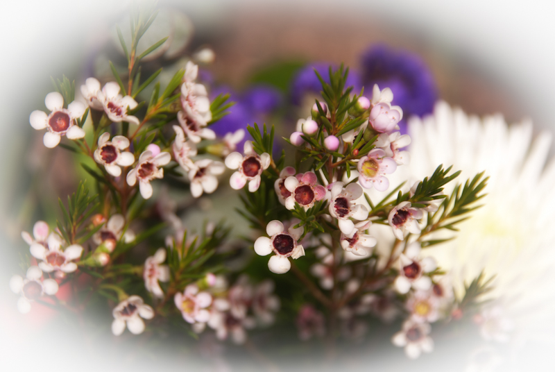 I saw a field of dandelions yesterday. They looked so bright and pretty, but I-5 is not a good place to stop for a photo. I love the wax flowers in the bouquet. I don’t think they grow locally, a florist’s staple that I think comes from California, they smell so sweet and are beautiful. 😀