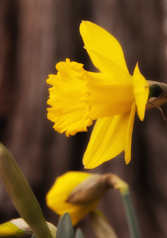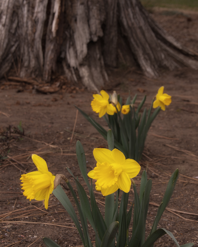 As I was going into the gym today, I noticed these daffodils in full bloom.  But what really caught my eye was the daffodils with these old, gnarly trees behind them.  I decided to photograph them with the tree in the background.  Not so easy.  The daffodils are low to the ground and a little distance from the tree.  My tripod wouldn’t allow the camera to go low enough to get the flower and the tree.  I couldn’t lie down on the ground as I was in my work clothes.  Alright, I could have laid down on the ground, but I didn’t.  The other option was to put the camera in a position I thought was correct and wish for the best.  I took a lot of really awful photos that were blurry and out of focus.  But I was able to get a few pretty much in focus.