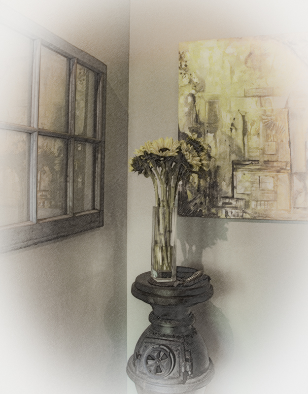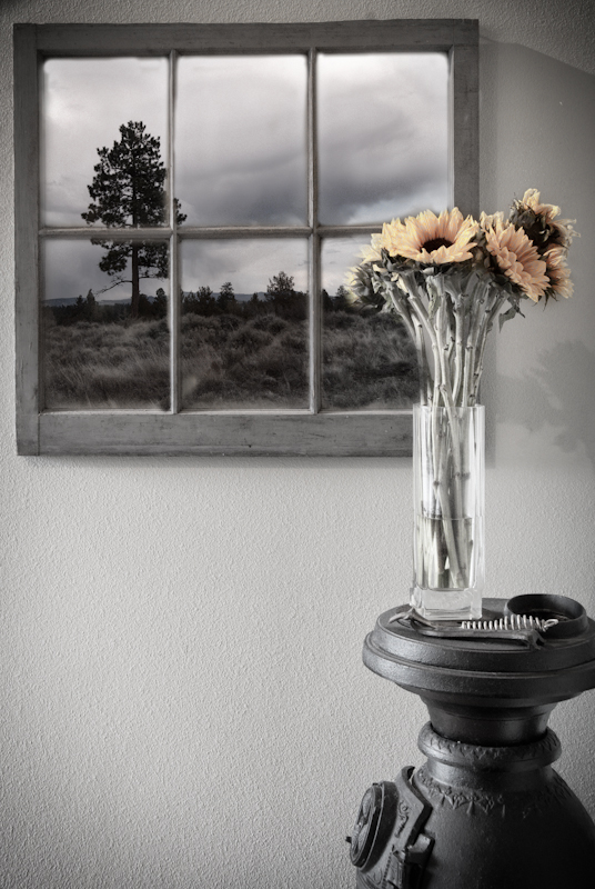 Both of these photos were taken in the entryway of our house. The first one is a corner where we have an old pot belly stove, a painting and an old empty window pane. I wanted to give this photo and old-time feel and used both Photoshop and NIK software.