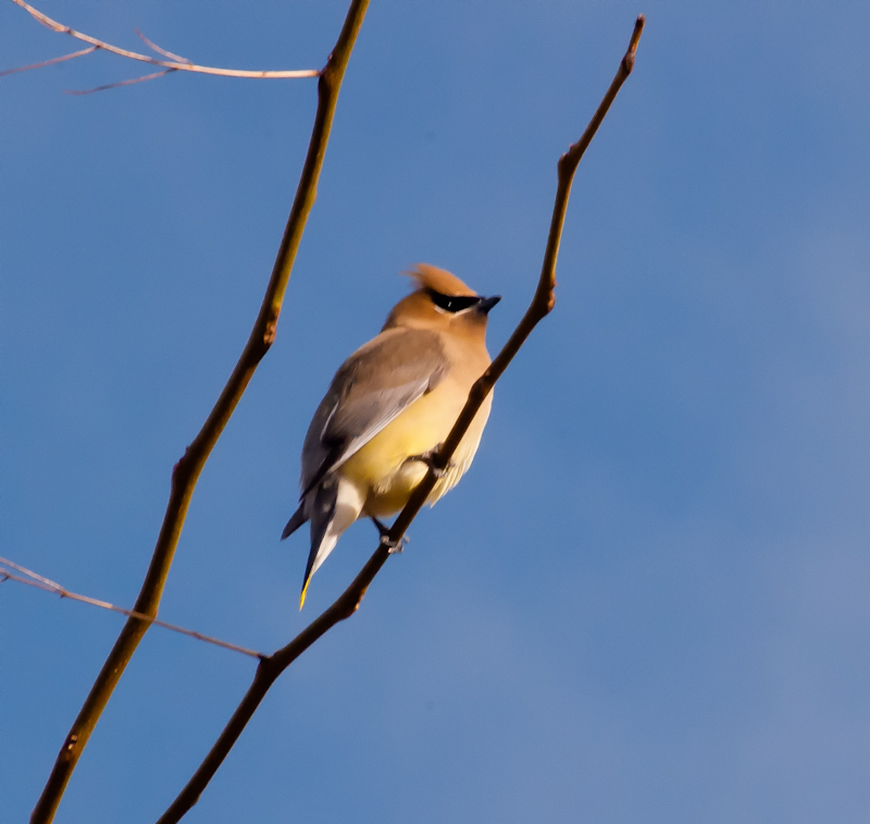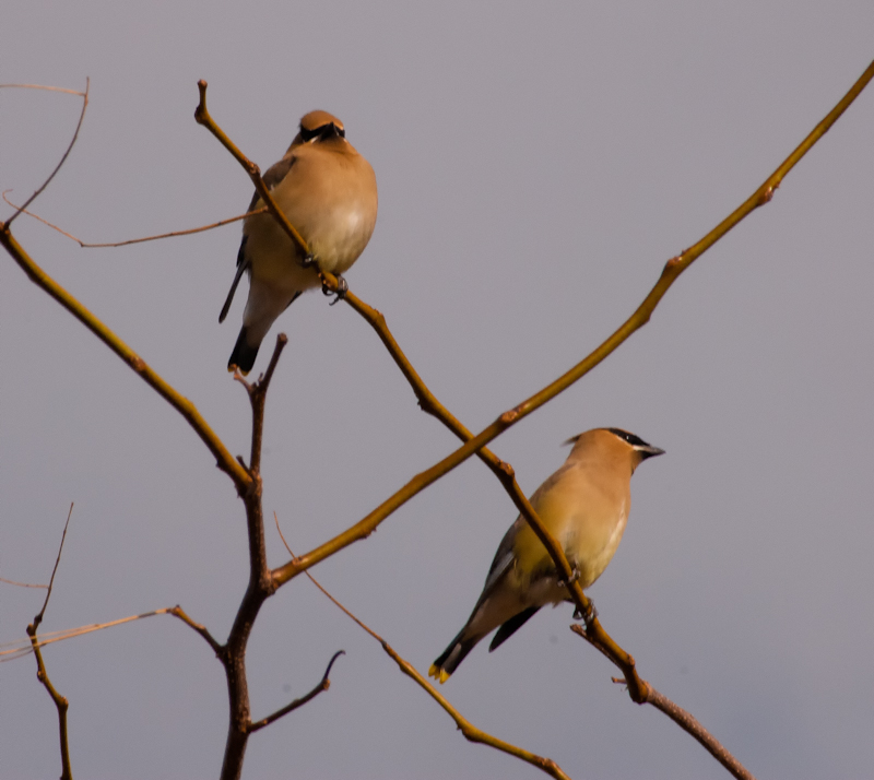 Maralee, those are such beautiful photos of gorgeous Cedar Waxwings. The lighting is perfect. We used to get them by the flock at our house. They ate the holly berries from the holly tress that grew at the back of our garage. There were holly farms everywhere in our area. Our holly trees went down in an ice storm. The back side of the trees were protected from the ice build up by the overhang from the roof. They simply got too heavy on one side and tipped out of the ground, the roots pulled up. At 20′ tall we had to way to put them back. The holly orchards fell to housing developments and are a thing of the past. The Cedar Waxwings went the way of the holly. So seeing your photos was a real treat today.