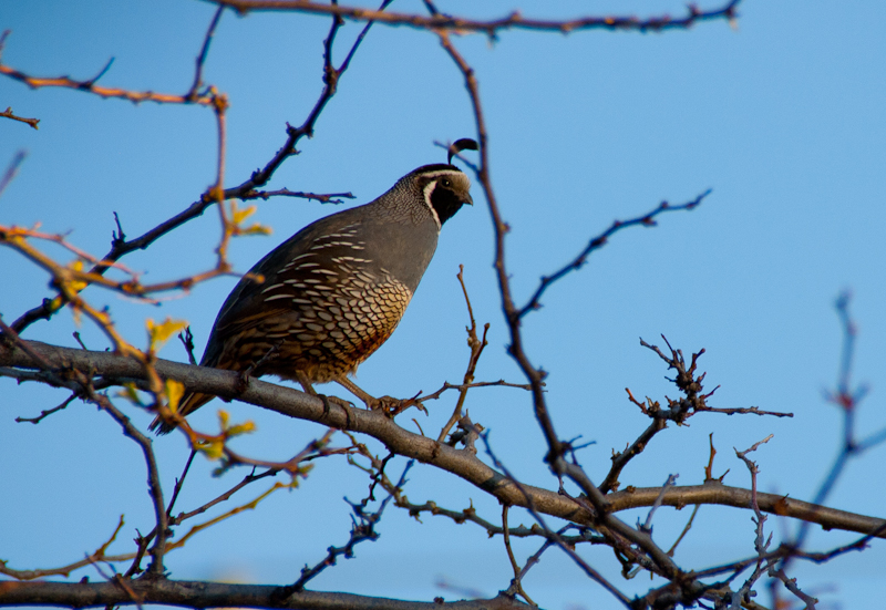 As I was driving up my driveway this evening, this quail in a tree caught my eye.  I don’t usually see them up in the trees – they’re usually running across the yard.  She stayed still long enough for me to grab my camera and take some shots.