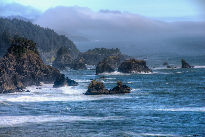 By the time we got to the coast, it was socked in with fog.  Occasionally we’d find a spot where the fog wasn’t quite as thick and could get some photos of the sea stacks.  That evening it looked like the fog might lift to get some sunset shots but it never materialized.