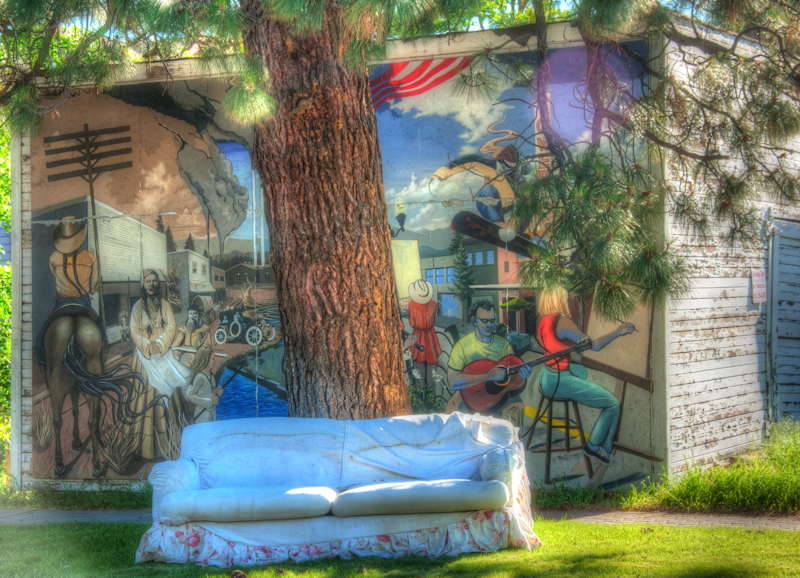 I saw this scene as I drove downtown today. I didn’t have time to stop so I went back after work and took this shot. I loved the mural on the side of the old, peeling building. I guess someone thought it would be a good place to dump their old sofa.
