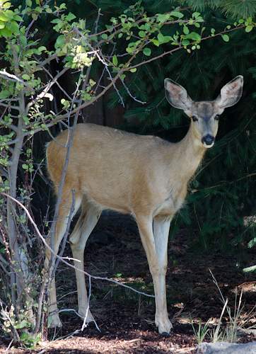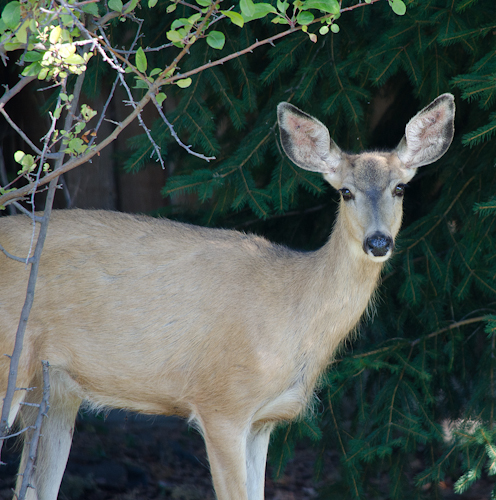 While sitting at my desk this morning with my morning cup of coffee, I saw a flash out of the corner of my eye coming from our front yard.  There were two young deer wandering past my window heading for our back yard.  I tried to quietly go out on our back deck to take photos of them but our squeaky screen door startled them.  One just stood frozen in time and waited for me to photograph it before hiding in the trees.