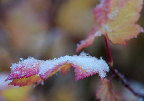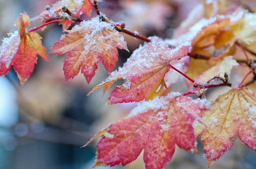 3. Beautiful photos of the colorful leaves decorated with white. It reminds me of a snowfall we had quite a few years ago in October. It was a heavy snowfall that stayed around for a while, and took down most of the electric wires with it. Because the trees still had leaves to catch the snow, it was too heavy for many of the limbs and they broke, taking the high wires with them. We were out of electricity for 5 days.