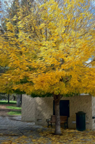 I just plumb ran out of time today.  I took a quick shot with my iPhone.  A rather uninteresting photo but I liked the color of the tree.  I decided to experiment with the photos.  One I processed on my iPhone with Pic Grunger and Photo Toaster.  The other I processed in Photoshop with an oil paint effect.