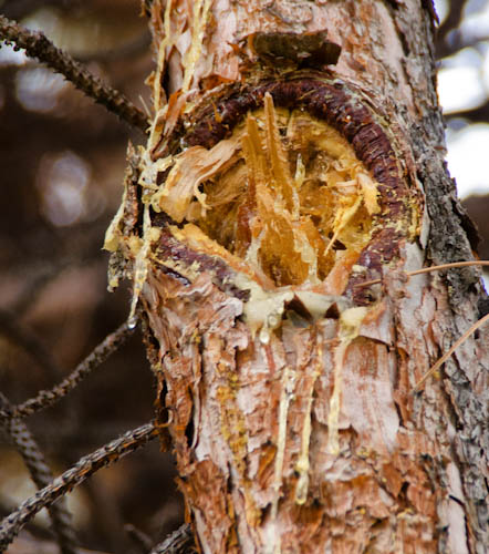 One was a section of one of the pine tress where it looked like a large branch had fallen off.  Where the branch used to be, the tree was oozing sap.  It’s not a very interesting photo, but you can see the sap running down.