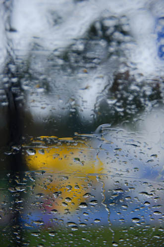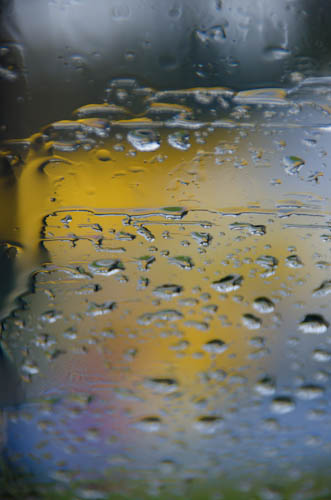 I took these from my car at the gym. One is of a tree with some leaves still on it and the other is two different versions of a water slide at the outdoor swimming pool. For all of the photos, I used a very shallow depth of field and focused on the raindrops on the windshield.