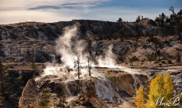 Maralee_Park_101013_08541-Edit-EditMaralee_Park_101013_08455-EditOur first stop in Yellowstone (after stopping for the grizzly photo in yesterday’s post) was Mammoth Hot Springs.  We walked along the boardwalk trails that have been built to navigate through the hot spring.