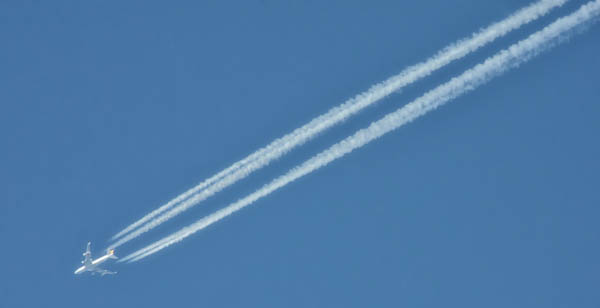 Maralee_Park_130215_43002-EditOn my way home yesterday, I noticed several jet trails crisscrossing the sky.  This one seemed particularly low – I could see the plane.  I got home in time to photograph it as it was going over my house.