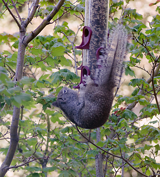 1. Those darn squirrels will do anything to get at the bird seeds. I have spent hours watching the ones in my yard. They are so entertaining. Love your sharp photos of this little fellow.