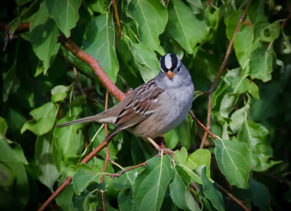I looked it up – it’s a White-crowned Sparrow.  It has just recently arrived in my yard and from reading about it, it seems this bird arrives in North America for the winter.  Does that mean we’re going to have an early winter this year?  It’s only September . . .  I’m not ready!!!