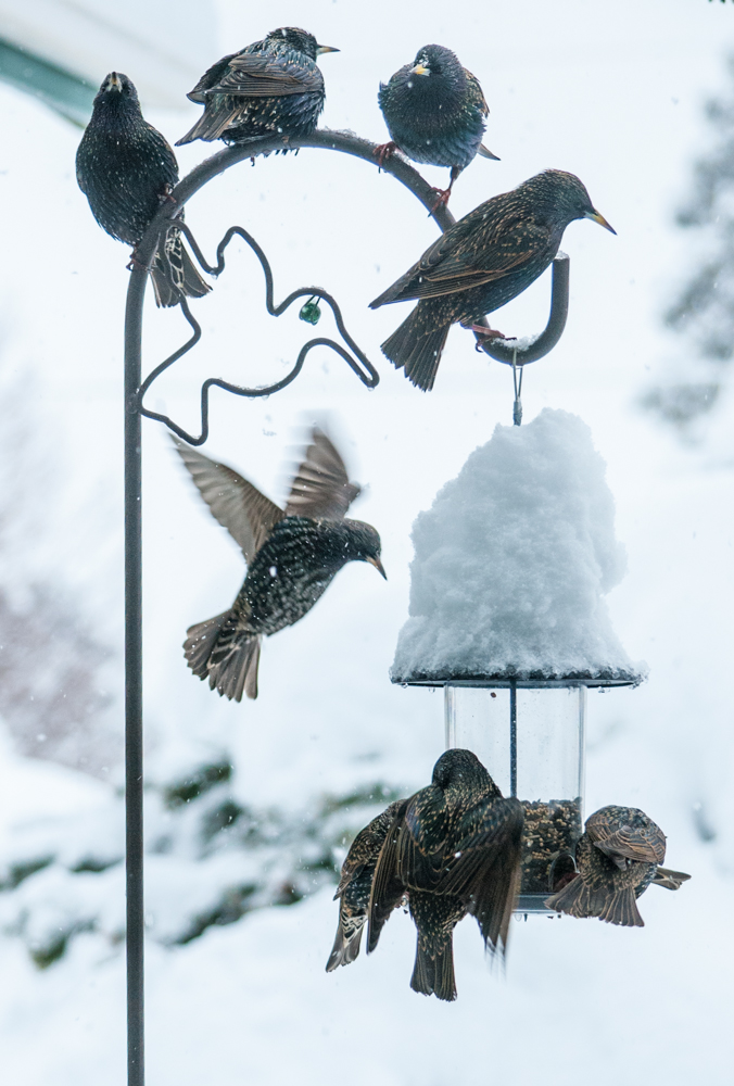While in the midst of our epic snowstorm last weekend, these birds would swarm in, in a group of about 100 birds settle in the trees in our yard.  Then a group would come and fight over the bird feeder.  They would take off again just as quickly.  This happened numerous times over the course of the day.