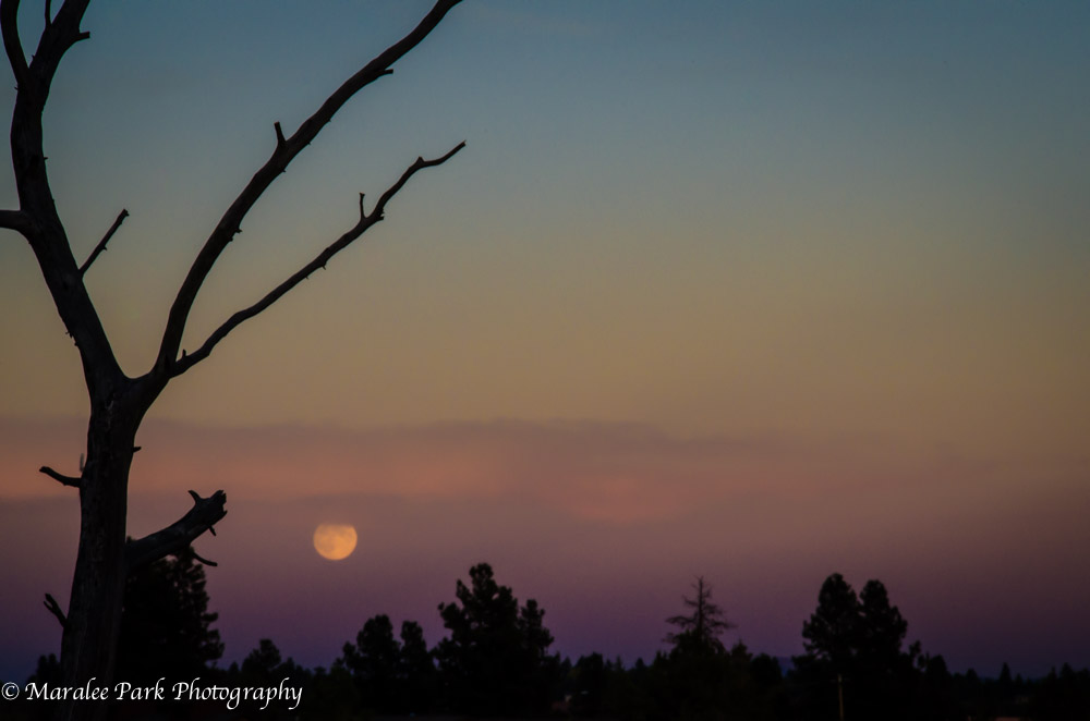 Tuesday evening I caught the moon rise early in the evening. I wasn’t sure I was going to be able to see anything because of a bank of smoke on the horizon caused by some controlled burns that are occurring in the area.