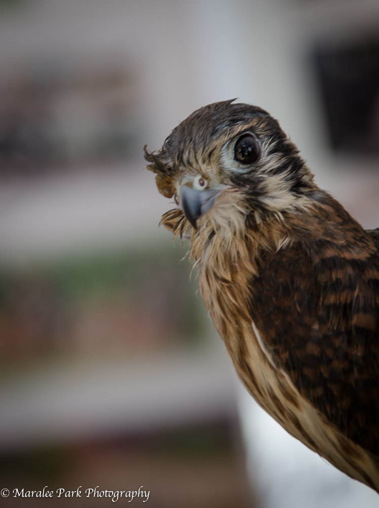 I think this is a small falcon but I’m not 100% sure. I’m sure one of my readers will know. This was another bird at the Wildlife Rescue and Rehab. It’s right eye is missing. It was pretty small . . . maybe 6-8″ tall.