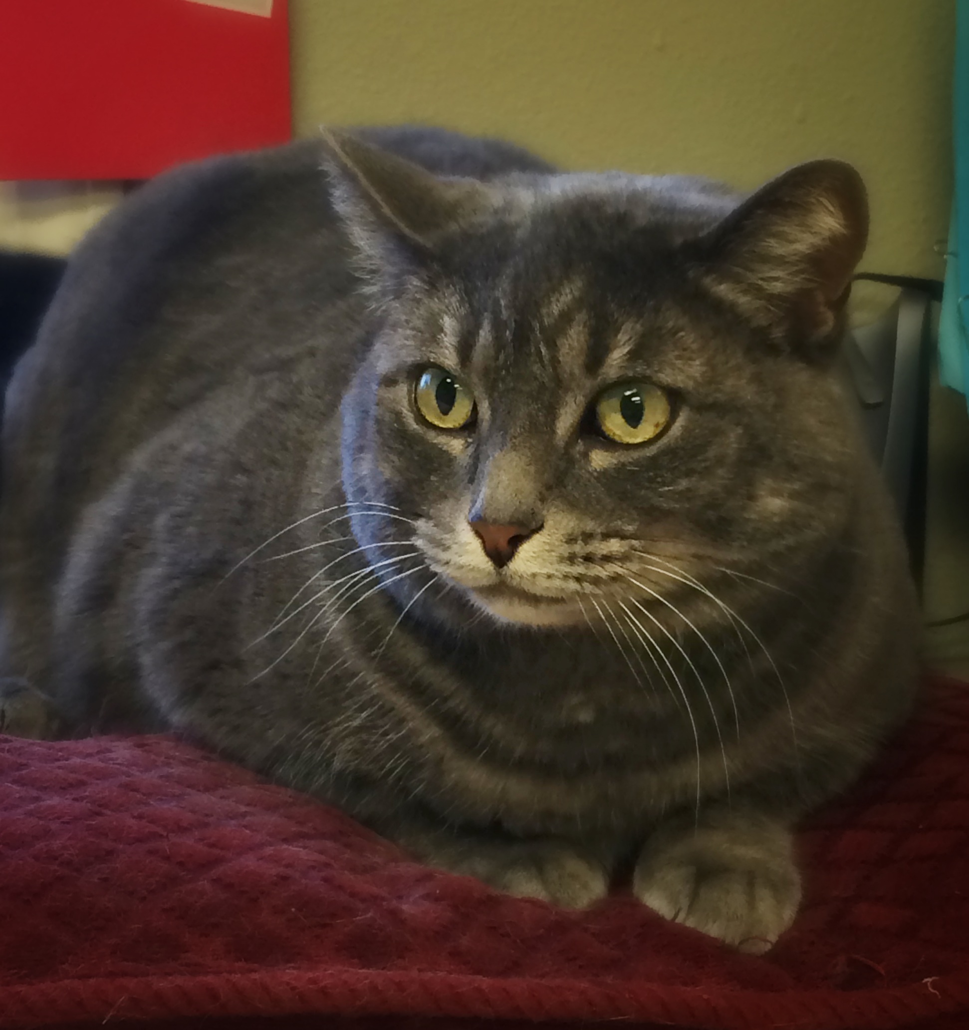 Judy, she showed up at our office in October of last year. We thought she belonged to someone in the apartment building next door. But she kept showing up at our door day after day so we started feeding her. It started getting cold out and we decided to try look for a home for her. A friend of mine was willing to take her but by that time we’d all grown so attached to her that we couldn’t give her up and decided to keep her as our office kitty. We had her checked out by a vet and she was in good health. She had a chip and they tried contacting the numbers on the chip but all the numbers were disconnected. So we got to keep her. And she is the sweetest, smartest kitty I’ve ever been around.