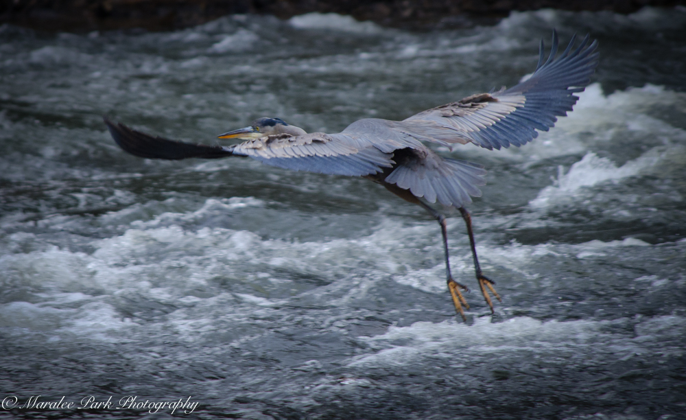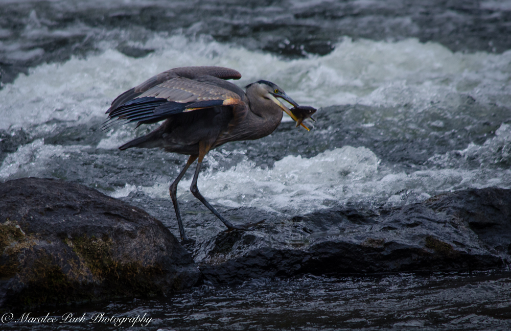 I’ve been “photo stalking” this great blue heron that has been frequenting the section of the river where I walk on my lunch hour every day.  Most of the time he just stands on a rock for long periods of time.  I had a few extra minutes one day and sat there watching it and was fortunate enough to watch it catch a fish and eat it.  It was the most exciting thing that happened to me all week.