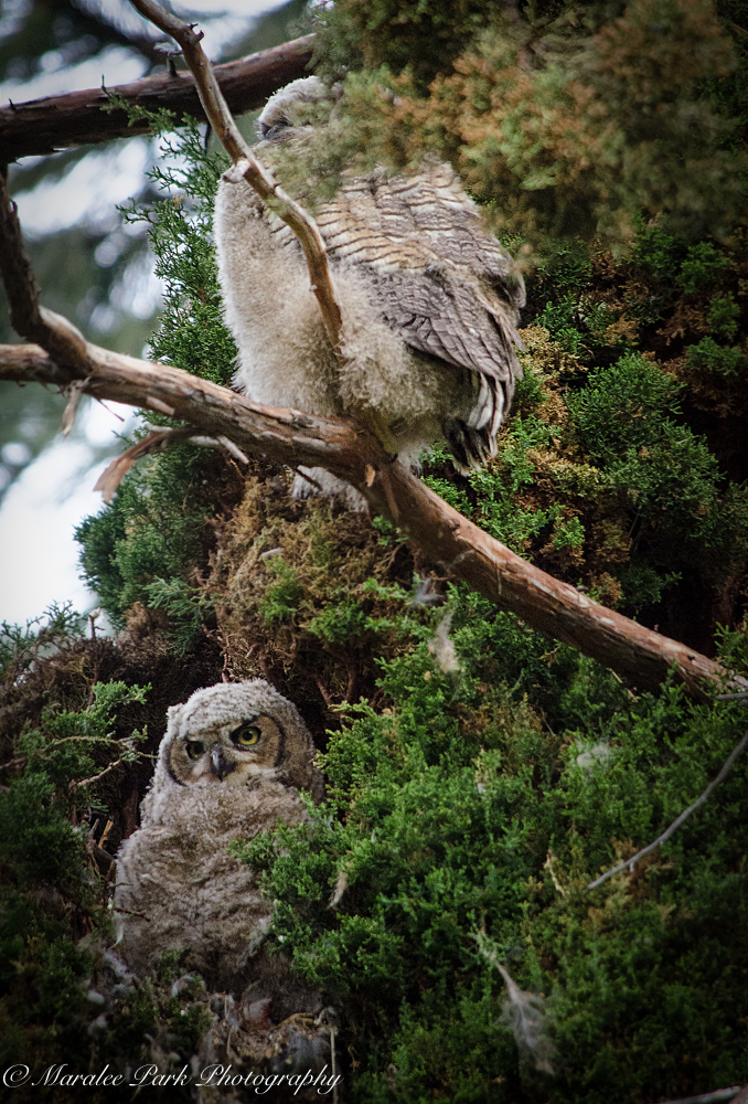 I’d been told that there were two owlets in the nest but until today I had only seen one. Here they are together, although one is sleeping. The one you see is the second owlet. It has a totally different look about the face than the other one and is a bit smaller.