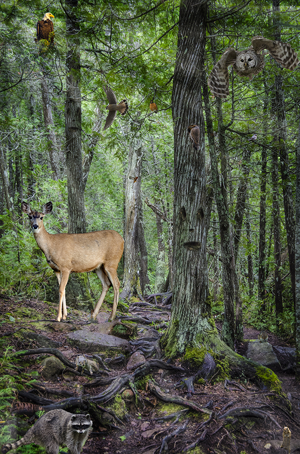 I had fun taking my photo from my hike in Minnesota and making in into a composite enchanted forest. I added some sun rays in Photoshop and then added some critters I’ve photographed in the past. Some of the animals are very obvious and others pretty small. I’ve added 11 critters … see if you can find them all. I didn’t take the time to adjust every critter to scale so some will be larger or smaller in proportion to the rest of the scene.