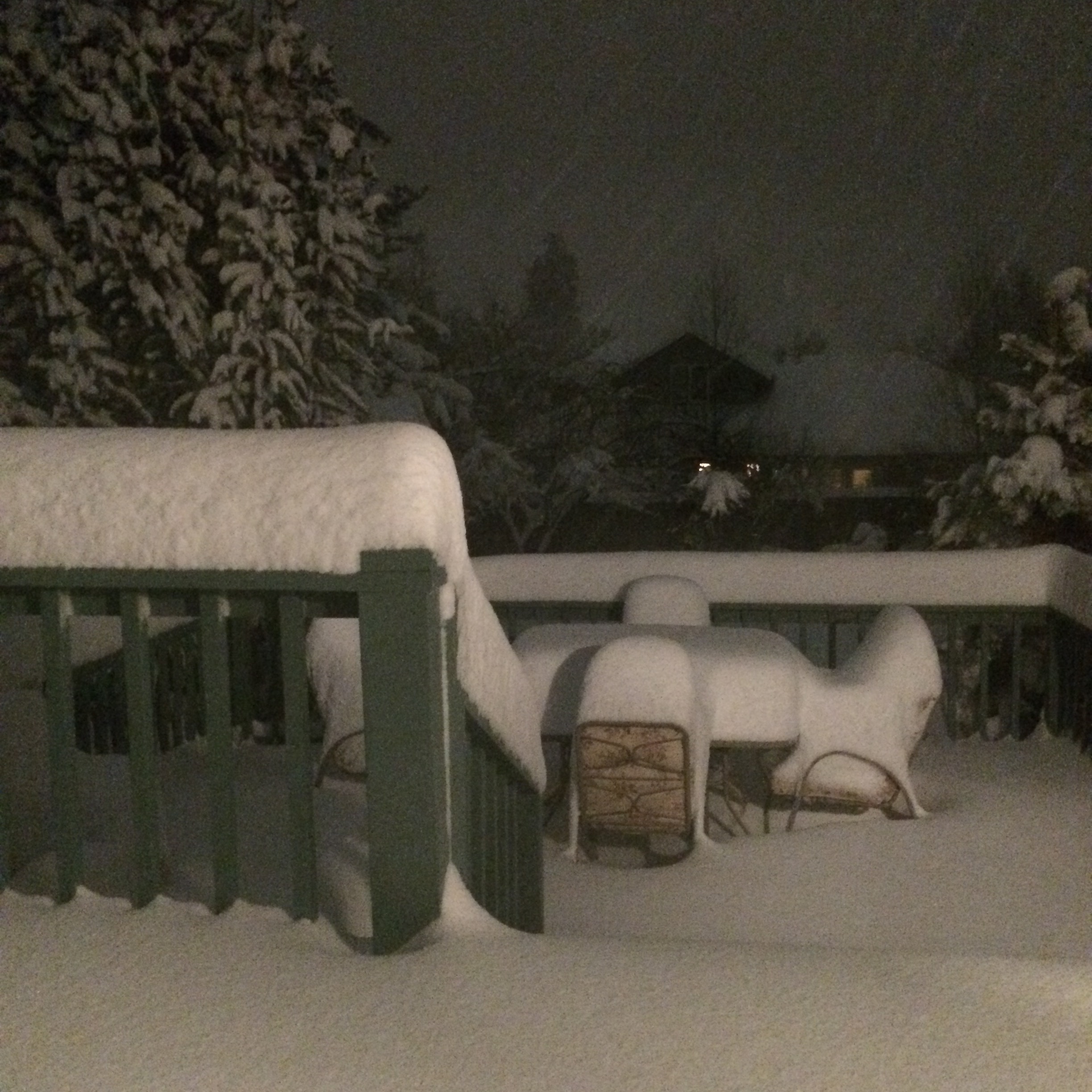 We had more than a foot of snow fall in the last 24 hours. I couldn’t get out of my driveway this morning so I’m stuck until I can get us shoveled out. We have a very long driveway so I’m thinking by Thanksgiving dinner tomorrow we should be able to get out. This was taken with my iPhone at around 10 p.m. last night and the snow was still falling.