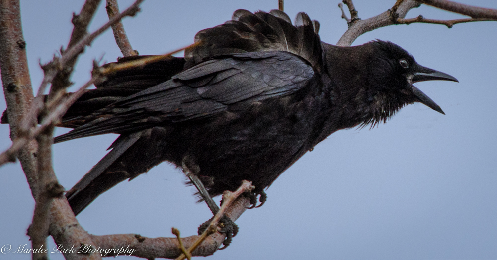This Raven was perched in a tree in a parking lot where I was shopping. It was talking to another bird in a nearby tree and making a lot of noise. They seemed to have a lot to say.