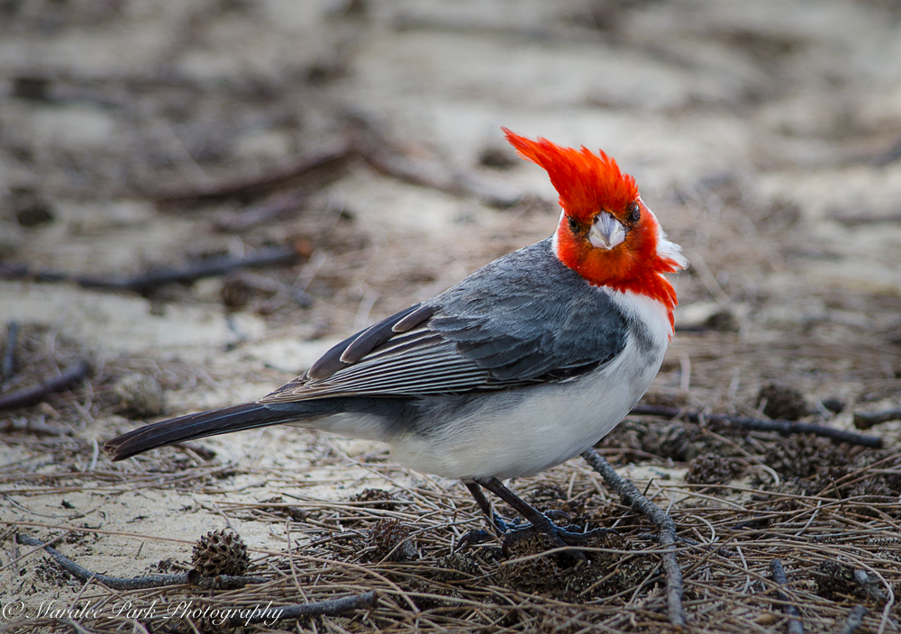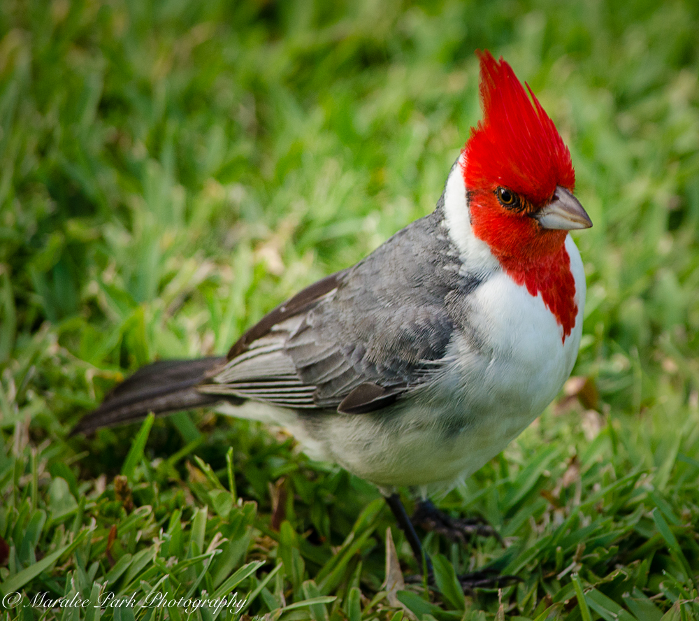 The Red-Crested Cardinal, or Brazilian Cardinal, was introduced to Hawaii from South American around 1930.  An interesting fact that I read is that notwithstanding its similar name, this bird is not closely related to the true cardinal family. It is called the Red Kramer, named after the character on Seinfeld, due to its similar “hairdo”.