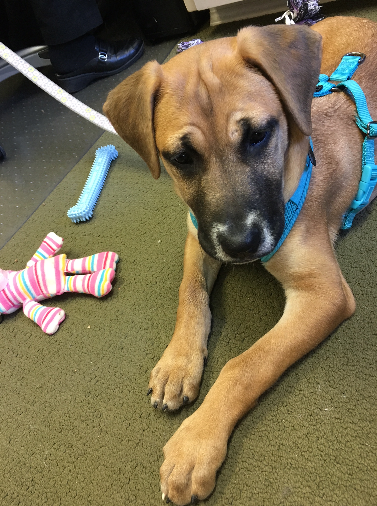 My co-worker has been bringing her new puppy, Nika, into the office this week while they are training her. She is one of numerous rescue dogs from a dog meat farm in South Korea. Miranda doesn’t seem to be too bothered by her being here, although she is keeping a wary eye on Nika.
