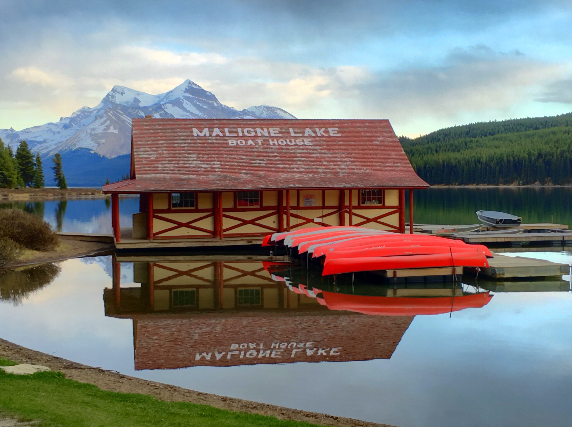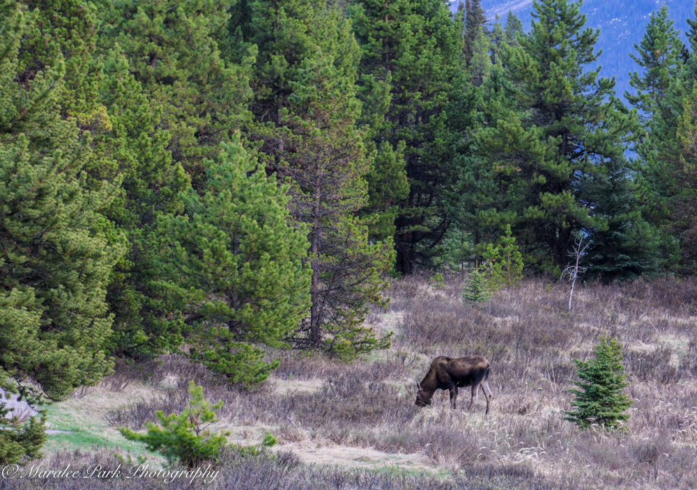 On our first trip up to Maligne Lake, it was a beautiful evening with no wind. I loved the reflection of the boat house on the water. And back in the distance a little ways we saw two more moose. Again, these moose were quite a distance away and we did not want to get too close. But what a gorgeous setting.