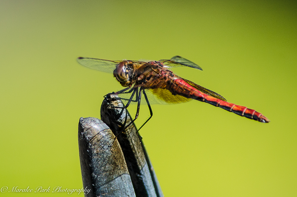 This dragonfly was perched on the tip of the beak of a stork statue. It stayed there for several minutes. I like how the sun was shining through the wings and left a shadow on the beak in the first photo. The photos are very similar but in the second photo it lifted its wings.