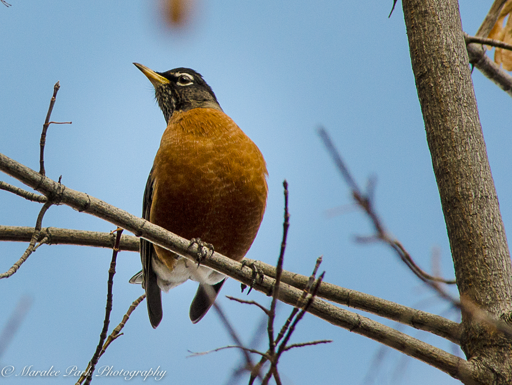 I have seen hundreds of robins flying around out in the country. In town, there are a lot, but not quite as many. I saw this one sitting in a tree while walking one day along with the junco. The juncos are finally starting to arrive for the winter.