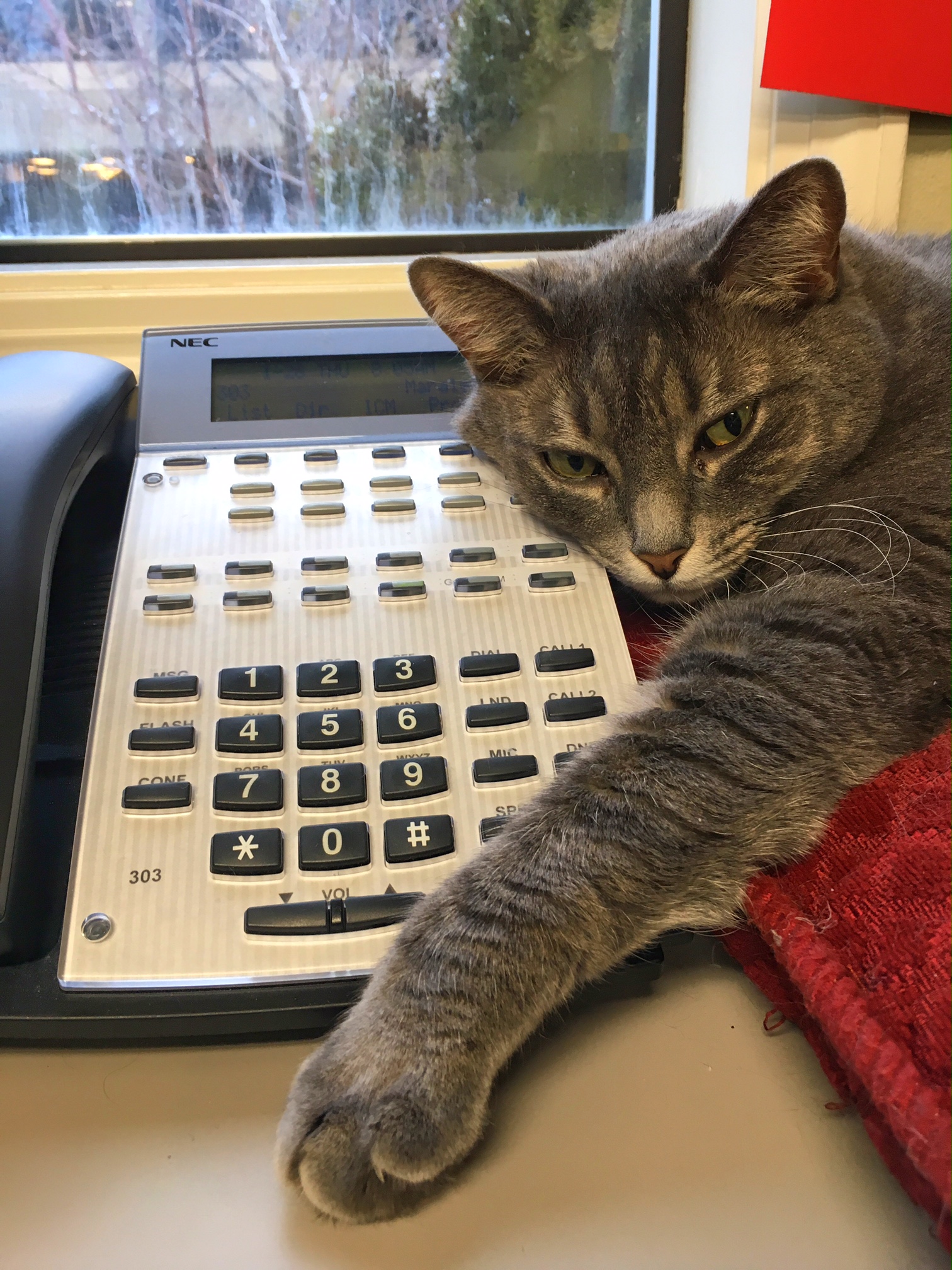 I can see on the phone screen that you took this picture last Thursday at 8:05am. Probably just before going to work.She knows your going to leave,so is hanging around the phone for your call. I’ve seen phones that have a camera on them so you can see & talk to each other during the day.I even saw one that drops a treat!