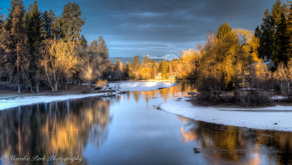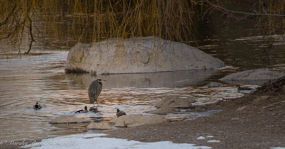 As I was driving to work this morning, there were some dark clouds over the mountains, but behind me the sun was breaking. I went down to the river, hoping that I’d get a beautiful glow on the mountains. That didn’t happen but I did get some beautiful sun rays coming through and highlighting some of the trees. I even saw my favorite heron fly in and land.