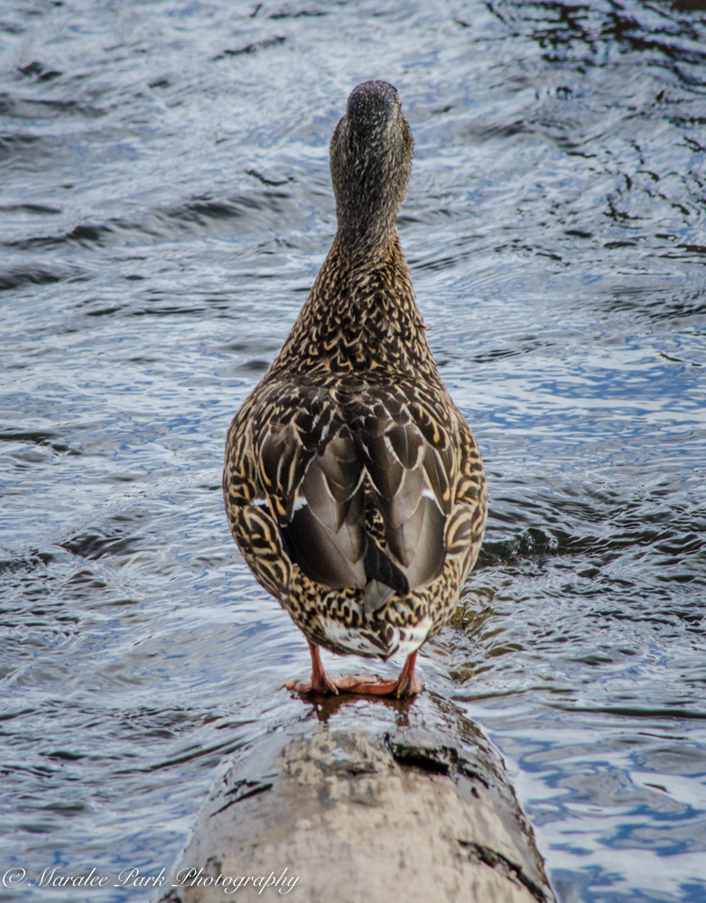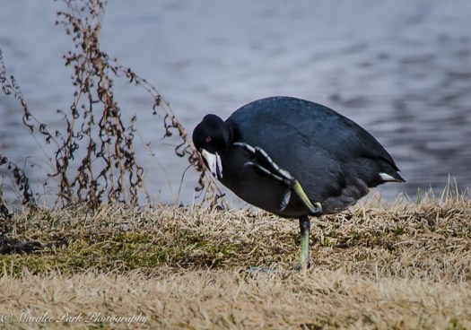 I photographed this coot near a pond and I think this is the first time I’ve seen a coot out of the water. I didn’t realize they were so round. :-). The duck was standing on the log trying to decide if it should jump into the cold water. It finally did.