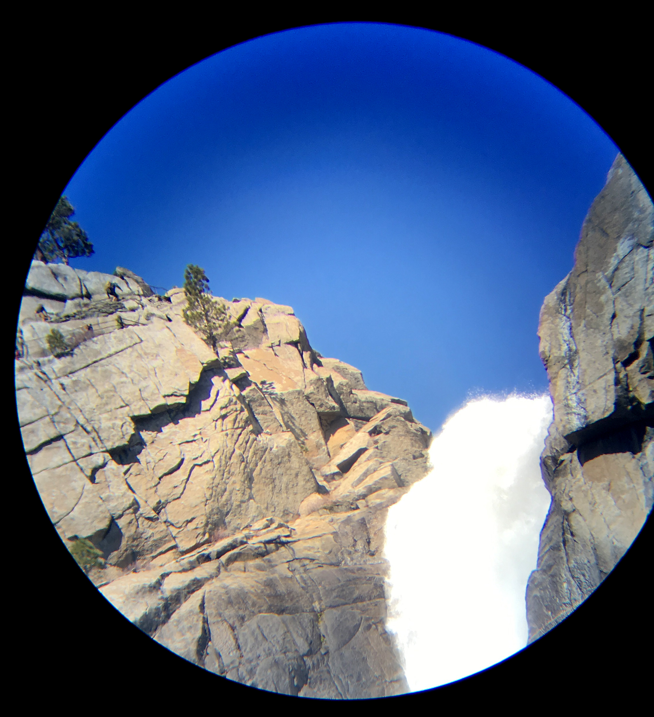 While we were there, two park employees came by with a scope spotter – a sort of telescope. Through that you could see the top of the upper falls and see people walking along the trail. I took a photo through the scope spotter with my iPhone and if you look closely in the upper left corner, you can see someone walking next to the railing.