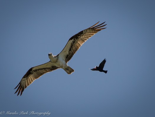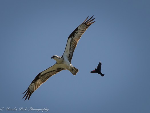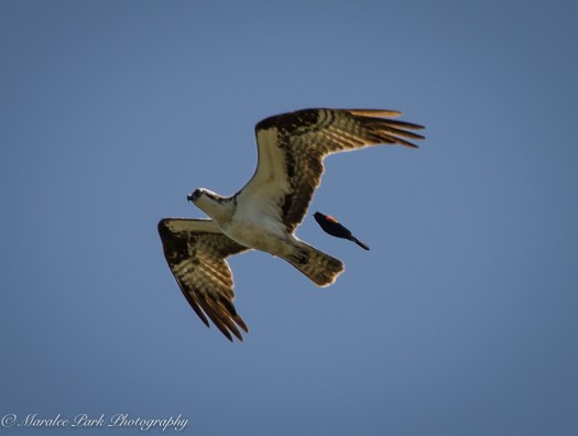 This osprey flew over me while walking along the river yesterday. A red-winged blackbird was following and harassing it along the way. What was it thinking? The blackbird eventually flew off.
