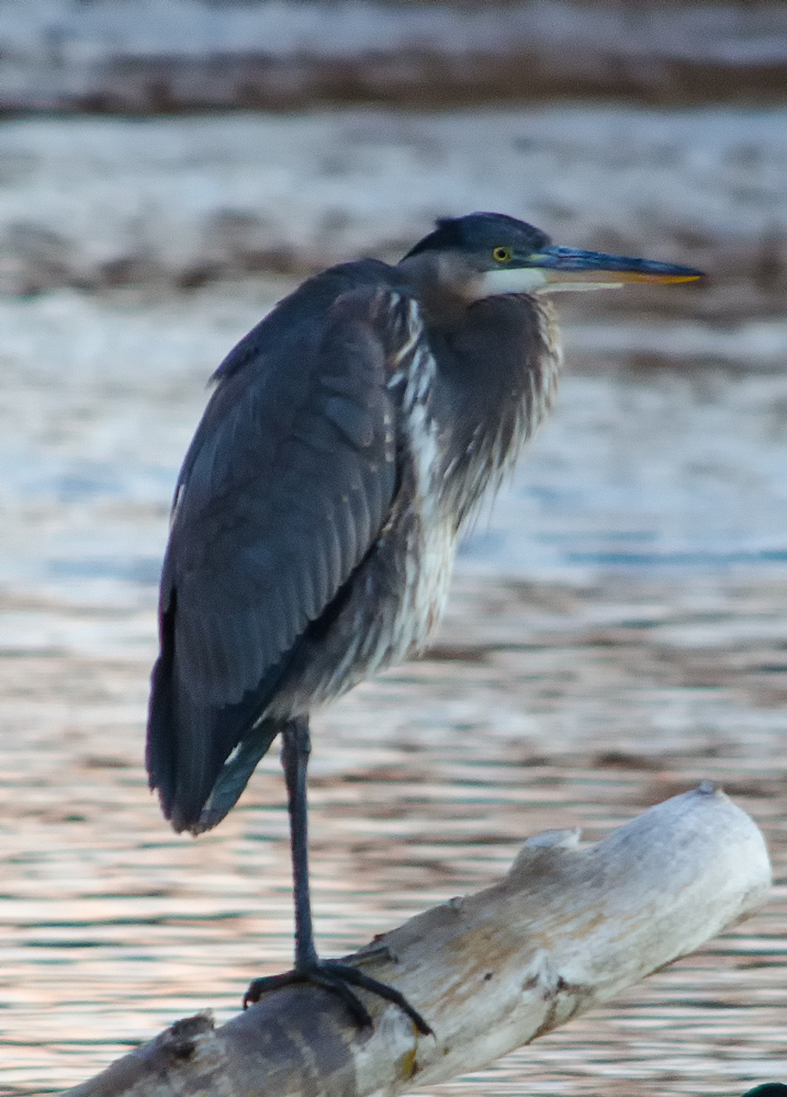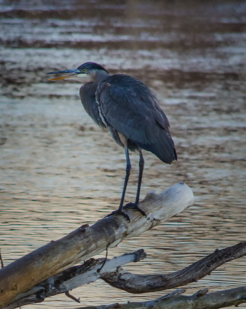 This morning I went down to the river hoping to get some sunrise photos. Lo and behold, there was a heron perched on an old tree sticking out of the river. It was the closest I’ve been able to get to a heron. The problem was the sun wasn’t up yet and there was not a lot of light so I had to crank up the ISO in order to get any shots at all. But I sat there on the wet, frozen ground trying to get some decent shots.
