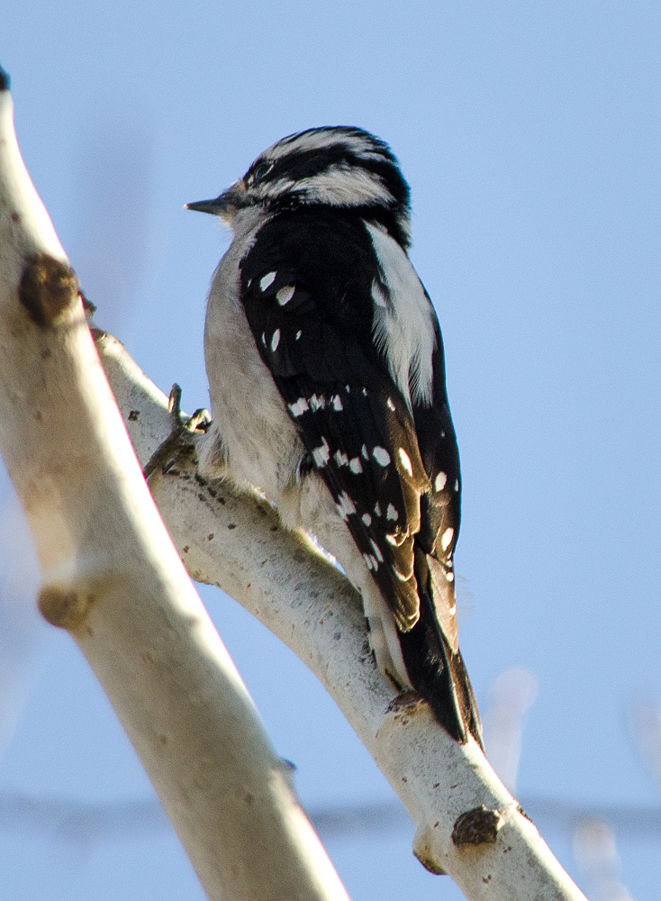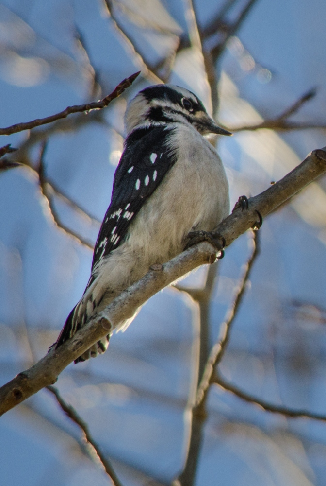 Last week, while walking around the neighborhood, I saw a small downy woodpecker in a tree. I didn’t have my camera with me so no photos. On Monday, I took my camera with me hoping that I might spot it in the same area. Voila!! There it was in a tree a short distance from where I originally saw it.