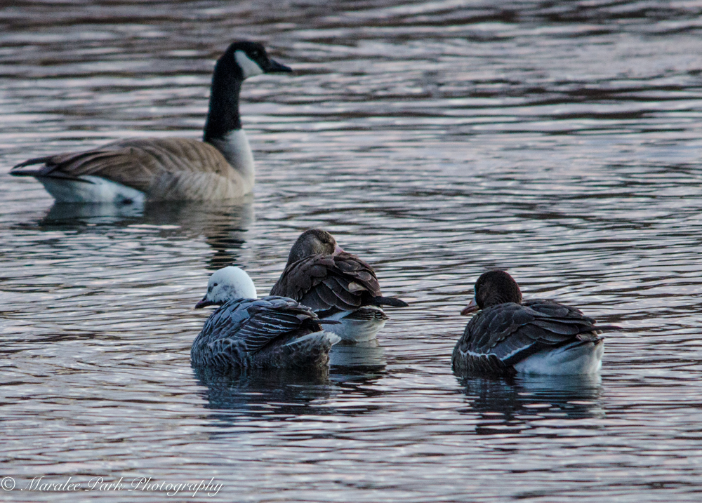 A couple of weeks ago I read about a sighting of a rare Emperor Goose in the area. I didn’t give it a lot of attention because I figured by that time it had long gone. But yesterday, while stalking my heron, I talked with a birder who told me the goose was still in the area and where it had been sighted. So this morning I got up at the crack of dawn and went to the river where it has been seen associating with other geese. And sure enough, there it was, among the Canada Geese and Greater White-Fronted Geese.