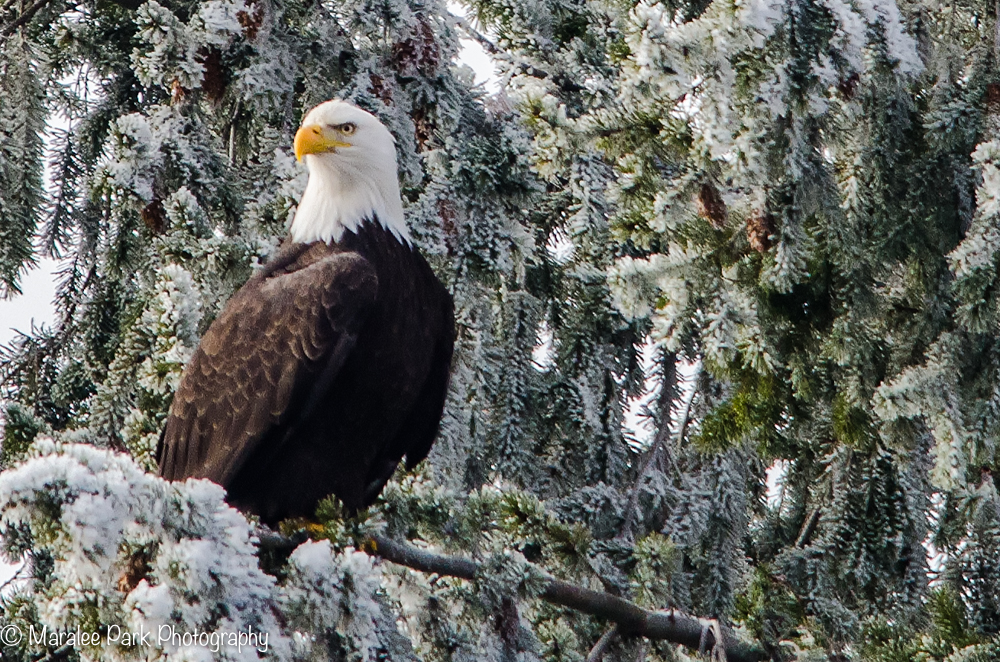 I went to the river to seek out my favorite heron and as I’m walking toward the river a bald eagle swooped down and landed in a tree across the river. If I had been there 15 seconds earlier, I would have been walking among trees and wouldn’t have seen it. Fifteen seconds later and it would already have been in the tree and I wouldn’t have seen it because it blended in with the frost on the trees.