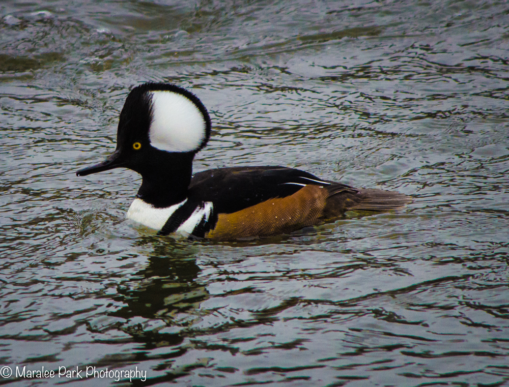 The first time I saw a hooded merganser (Lophodytes cucullatus) I had no idea what kind of duck it was – I just knew that it was unusual and beautiful. The name is derived from the Greek language meaning “crested” “diver.” Males are very distinctive with their large white crest surrounded by black.