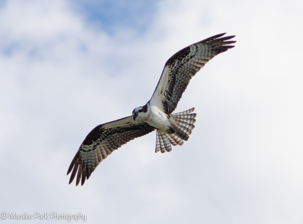 When I got to the nesting area, Scarlett was sitting on the post near the nest eating something. It was probably a fish but it was difficult to tell. I believe this is Scarlett because of the flecking on her chest.