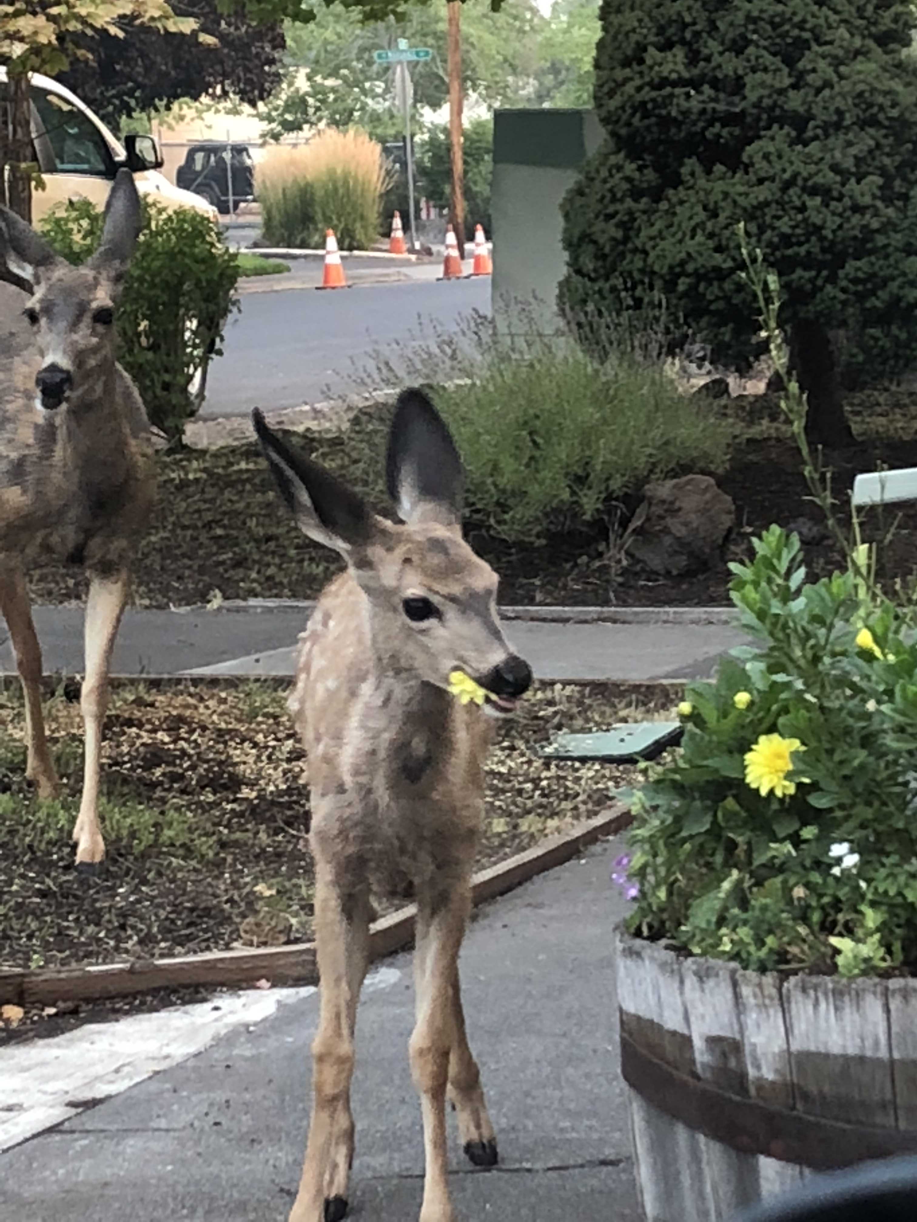 Posted on August 23, 2018 by Tuxedo Sophisticated CatWho’s Been Eating our Flowers Not a great photo – taken from my car with my iPhone. This is what greeted me when I drove up to the office this morning. Now there is no doubt where our flowers have been going – Bambi has been eating them. Fawn eating flowers Maralee Rate this:Share this: Click to share on X (Opens in new window) X Click to share on Facebook (Opens in new window) Facebook Click to email a link to a friend (Opens in new window) Email Click to share on LinkedIn (Opens in new window) LinkedIn Like Loading... Related