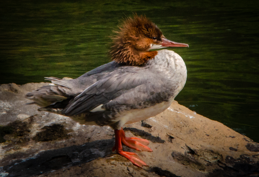 I don’t often walk along the river on my lunch break during the summer – it’s just too hot. But it has started to cool down slightly so I went out one day last week (it was still a little too warm for my taste). This female common merganser had just taken a bath and was settling down on the rock to take a rest. She hadn’t even combed her hair yet.