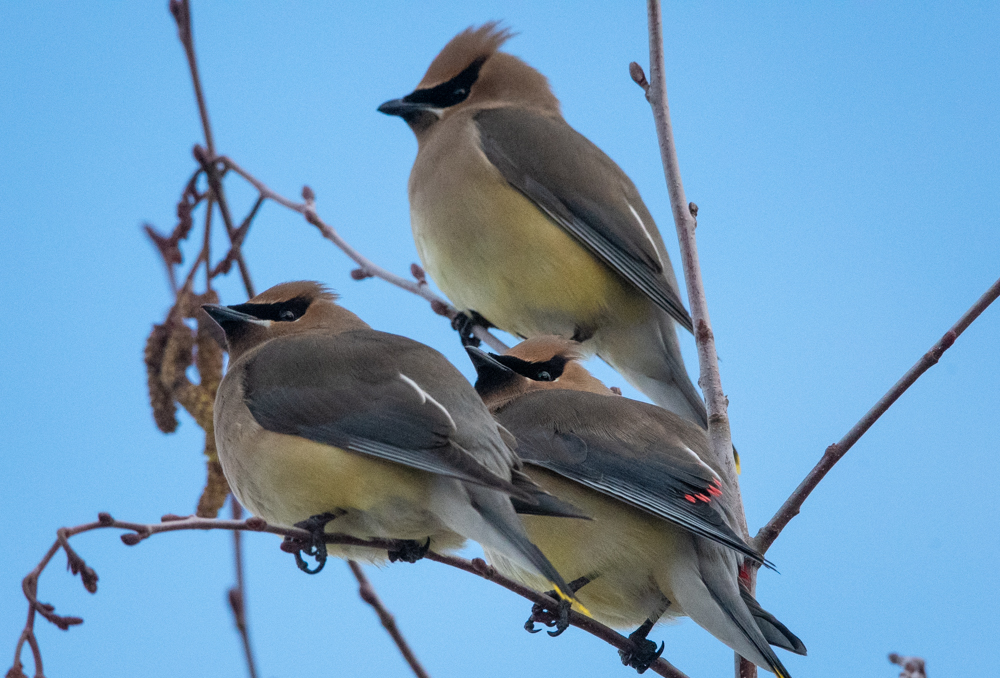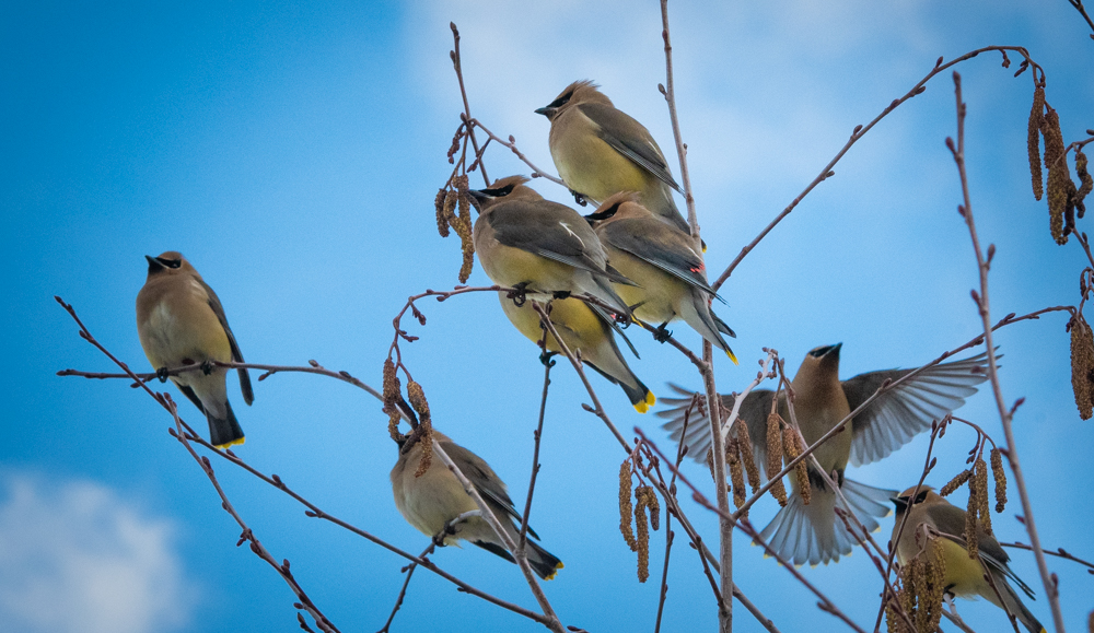 Posted on March 30, 2019 by Tuxedo Sophisticated CatZorros I came across this flock of cedar wax wings while walking along the river. They remind me of Zorro with their little black masks around their eyes. Maralee Rate this:Share this: Click to share on X (Opens in new window) X Click to share on Facebook (Opens in new window) Facebook Click to email a link to a friend (Opens in new window) Email Click to share on LinkedIn (Opens in new window) LinkedIn Like Loading... Related