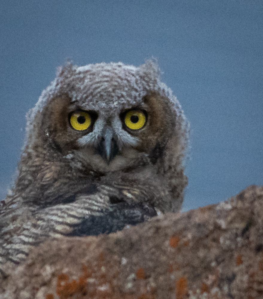 I heard them before I saw them . . . two little (maybe not so little anymore) owlets perched high above me on a rock ledge. I took a number of photos but for now this is the only one I’m going to post.
