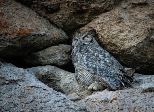 When I saw the owlets a few days ago, I checked all of the nearby trees to see if I could see mom and/or dad. Generally, the parents stay fairly close to where the young owls are. But I didn’t see either of them. But as I was about to leave, I took another glance up to where the owlets had been and there, on the side of the rocks, was one of the parents. He/she was sleeping and after a bit opened its eyes to look around and the promptly went back to sleep. He/she was very well camouflaged on the side of the cliffs.