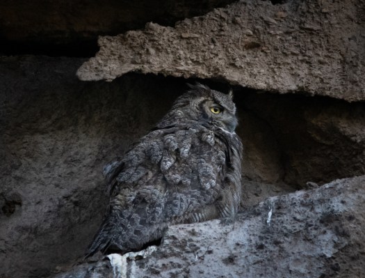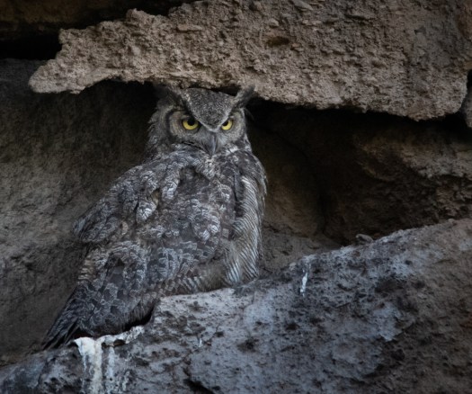 I hadn’t been back to the area where I saw the owls last week so I decided to go back this evening. There was nothing in the location I saw them previously but I walked around a bit and the located a parent in a crevice high in the cliffs. Knowing that the parents generally stay fairly close to the young ones, it didn’t take me long to locate them. You will see them tomorrow.